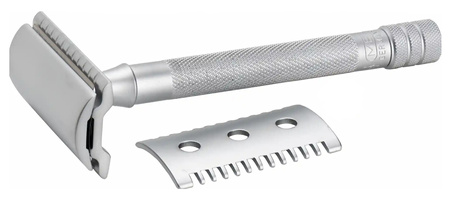 Model Merkur 22C został pierwotnie opracowany w latach 20. XX wieku. Jego oryginalny design i niezawodna jakość sprawiają, że jest to ponadczasowy klasyk: długa, radełkowana rączka zapewniają dobry chwyt nawet mokrymi, namydlonymi palcami. Maszynka wyposażona jest w dwie płytki - z zamkniętym i otwartym grzebieniem, dzięki temu maszynka jest niezwykle uniwersalna. Na co dzień możesz używań zamkniętego grzebienia, a gdy masz więcej czasu bądź potrzebujesz dokładniejszego golenia - otwartego.