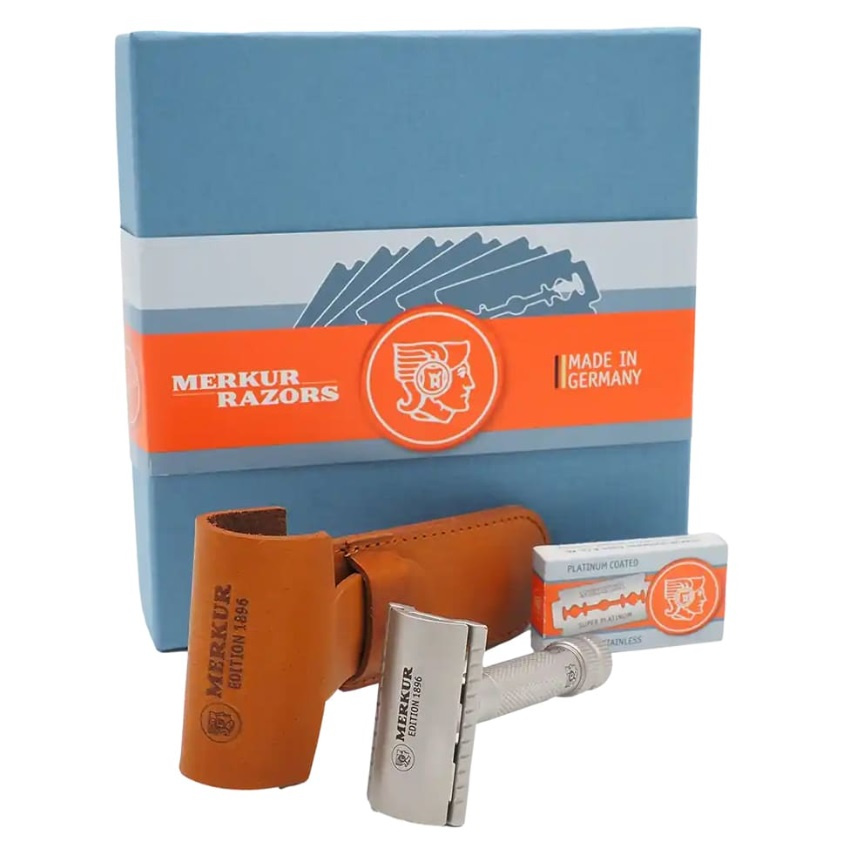 Zawartość: maszynka do golenia, żyletki, skórzane etui podróżne