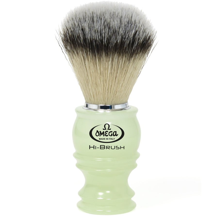 Pędzel do golenia Omega 46800, włosie syntetyczne Hi-Brush, przezroczysta żywica zmieszana z fosforyzującym proszkiem pigmentowym daje ciekawy efekt.